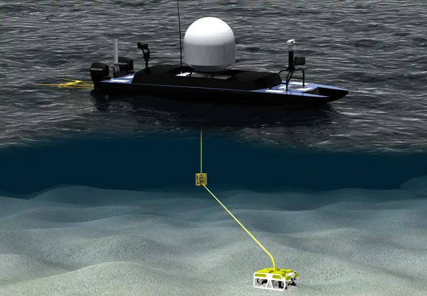 Remote Surface Vessel - Patrols and is operated remotely from a control room anywhere. Features radar, video, thermal imaging, sound monitoring, and more. Can tow a tethered UAV by replacing radar dome with winch. Tethered UAV (drone) can be deployed 400 feet below with Wahoo patrolling above.