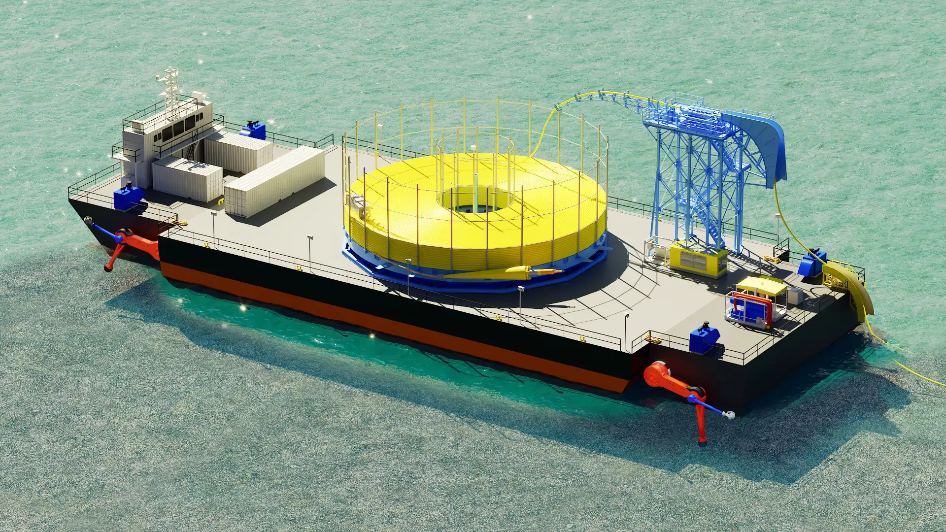 The replacement installation carousel barges are towed to the DP End Cap/Crawler keeping the installation components in the field. UTAs are landed on both ends into target boxes within range of the OFLs (Optical Flying Leads). Once a carousel barge is empty, the DP End Cap/Crawler modules are released then connected to the next full carousel barge. The deliveries from cable manufacturers around the world can be coordinated with installation progress so transit distances are shortened. Installation of the next cable leg continues and the process repeats. The DPC (DP Crawler) is ideal in calmer water and especially shallow water as it can move along the route with DP azimuthing thrusters and when water is too shallow for thrusters, the crawler legs are lowered and crawl along the bottom remotely. This JUMA Energy proprietary system eliminates the difficulty of moored shallow water applications and deeper DP applications and will allow us to lay cables along the coast, into outlets, and in rivers where conventional installation vessels are unable to perform.